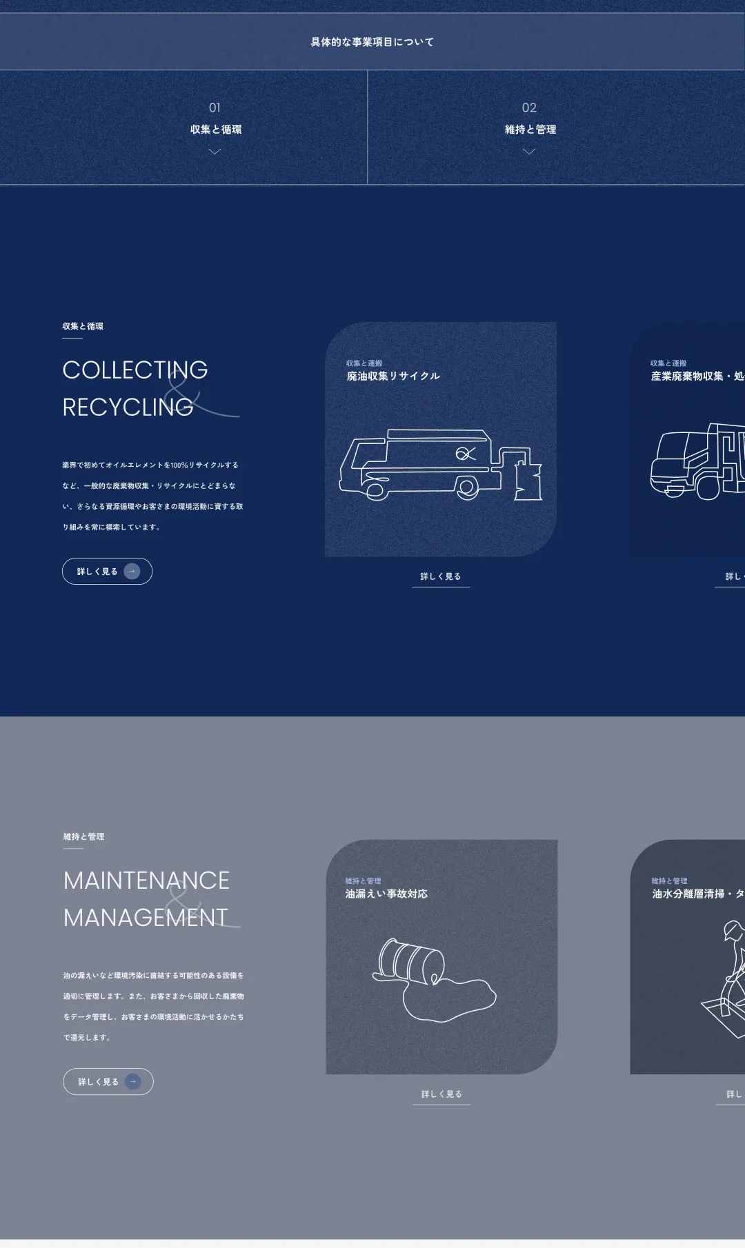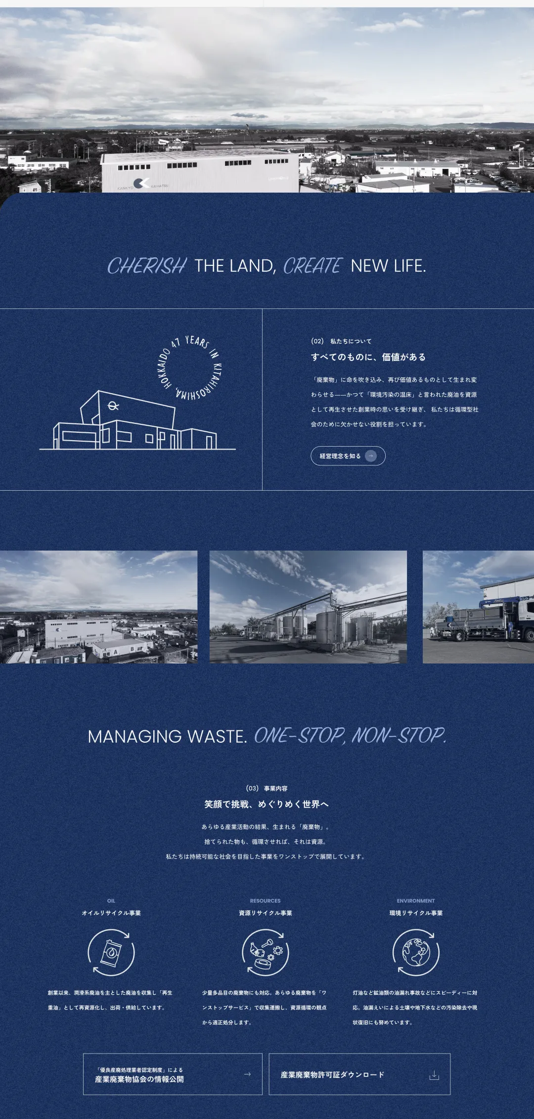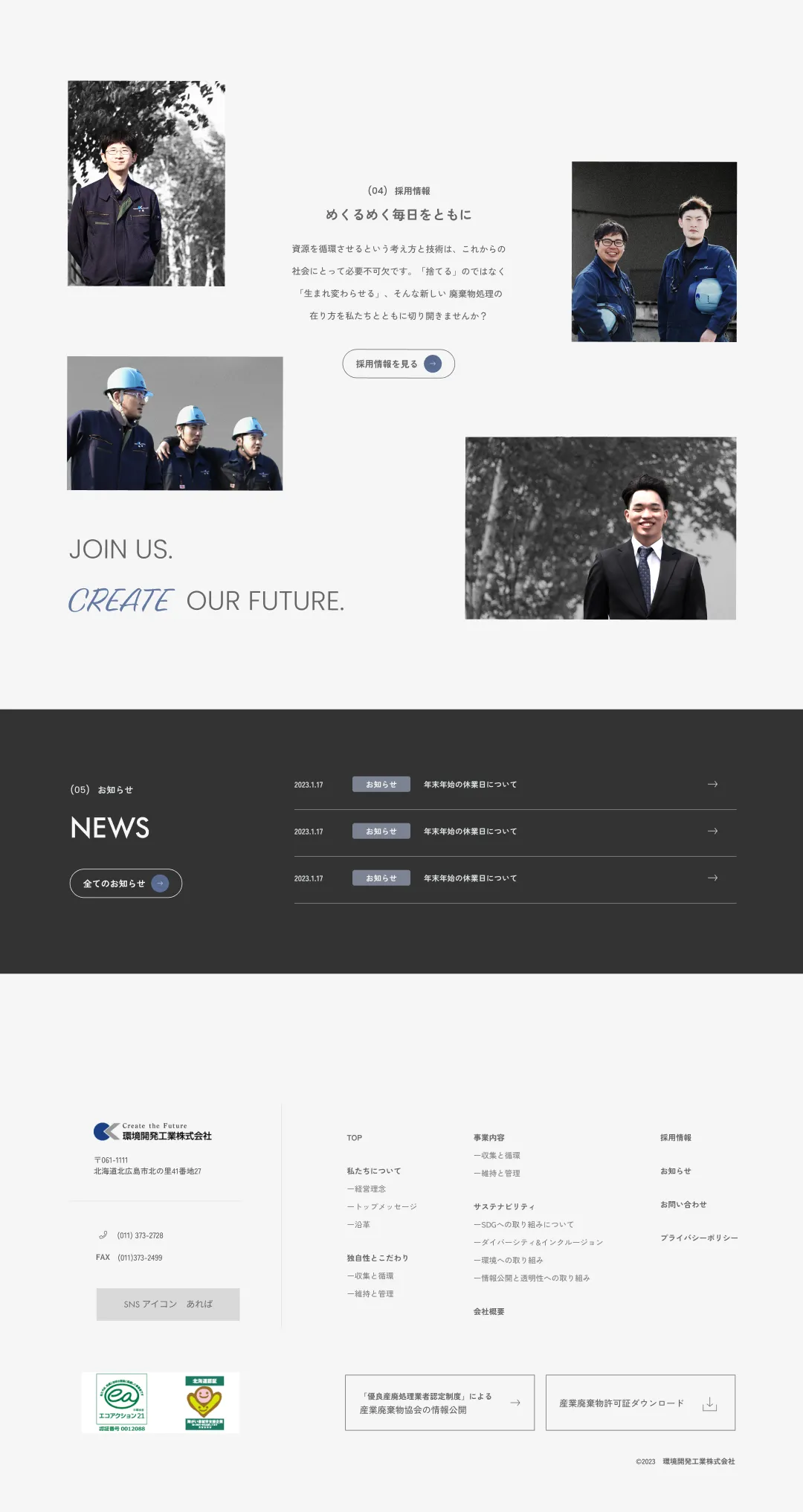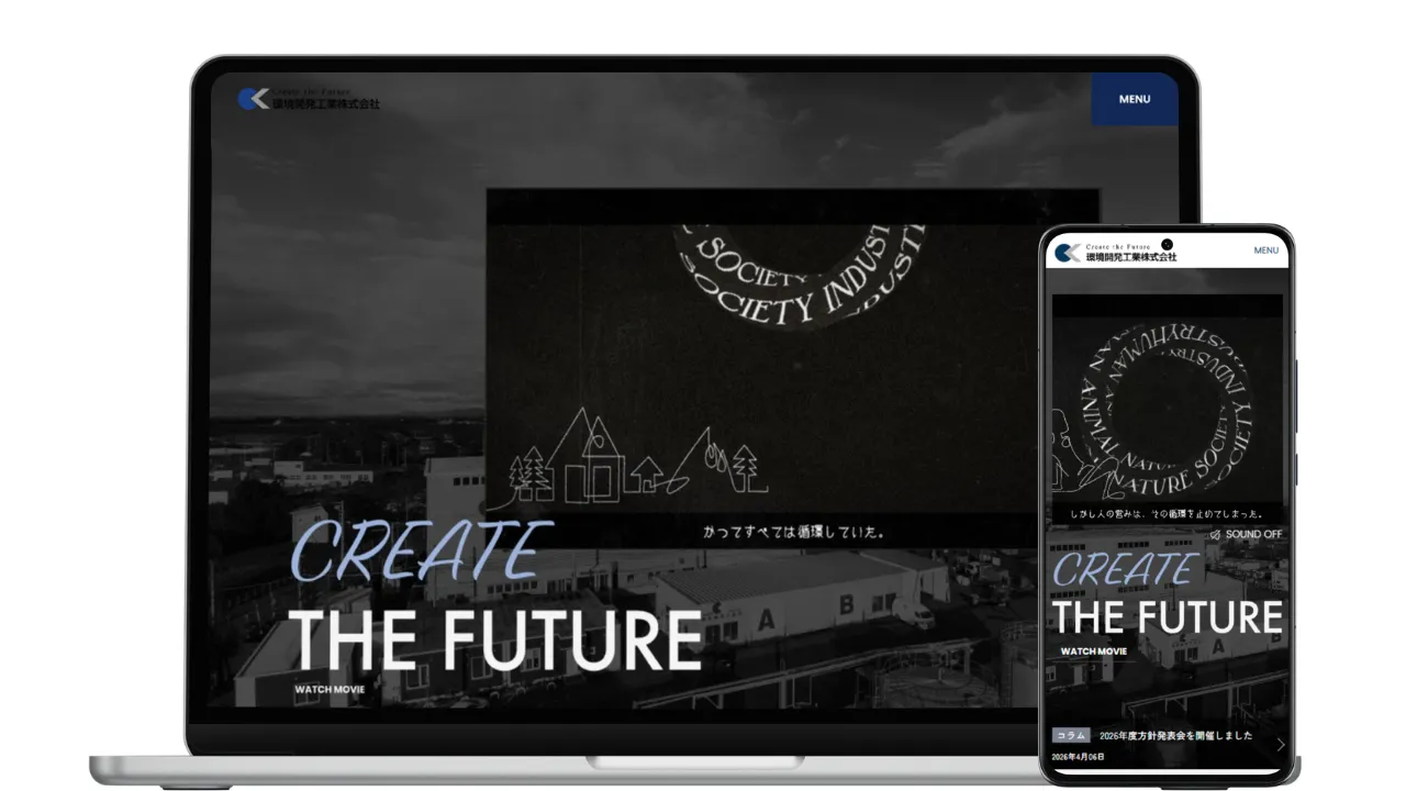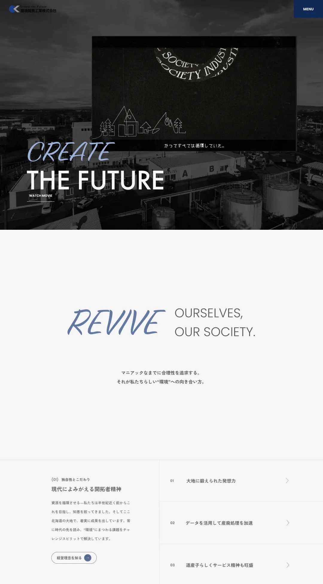 産廃業は面白い ー北海道の新進企業である環境開発工業様の企業サイトで表現を試みたのは、難題を独自の視点で乗り越えてきたクレバーさ。サイトのコンセプトを「独自性」とし、TOPページはコーポレートカラーの青を主体に、高い社会貢献性を訴えています。青は「静脈産業」と言われる産廃業を表現しています。コピーも全て一般的な表現を避け、制作の過程で得たトピックスも「独自性とこだわり」という特設ページにまとめました。そして会社の「今」をより具体的に色濃く表現できるようコラムを設置。それぞれ奇抜な手法ではありませんが、構成や要素、デザインやコピーの細部までこだわり、環境開発工業様の独自性を表現しています。